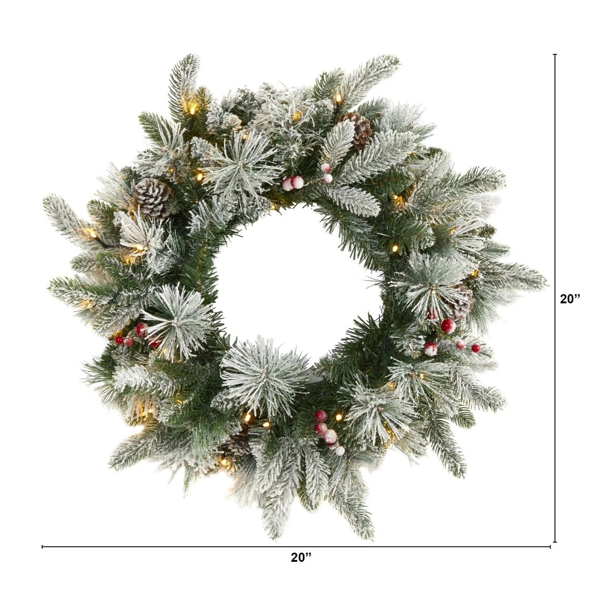 20-in Flocked Mixed Pine Christmas Wreath With LED Lights, Pine Cones & Berries