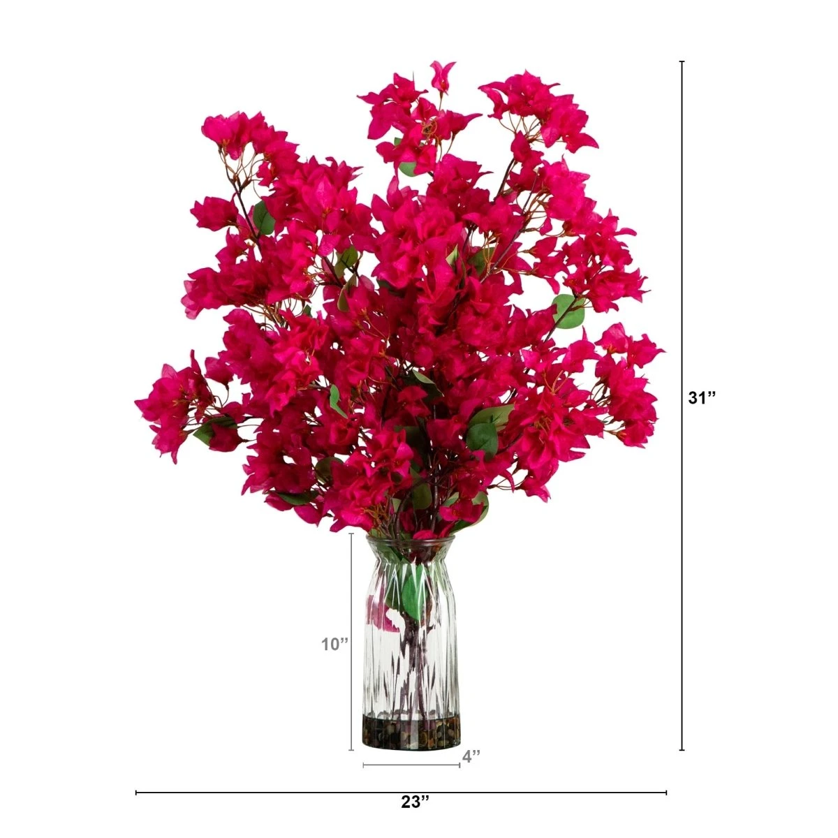 Brighten your space with the timeless beauty of this 31” Artificial Pink Bougainvillea Arrangement in Vase. Featuring vibrant pink blooms and lush green foliage, this lifelike arrangement is carefully crafted to mimic the natural elegance of bougainvillea. Displayed in a sleek, modern vase, it’s a ready-to-show centerpiece perfect for tables, desks, or mantels. Whether you’re adding a pop of color to your home, office, or special event, this maintenance-free arrangement delivers lasting charm and sophistication.