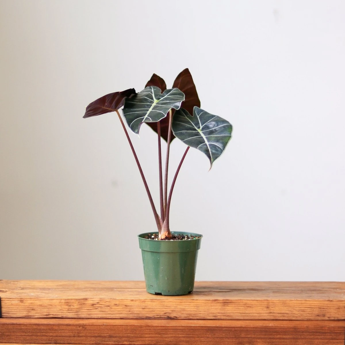 A shop favorite and new addition, the Alocasia ‘Dragon’s Tooth’ seems to combine all the best qualities of other Alocasia varieties. It’s dark, glossy color and ultra light veins make it appear reptilian and striking against more common houseplants. To care for this plant provide it with t bright, indirect light. And while you can allow the soil to dry between waterings we find more success when we don’t let Alocasia fully dry, especially if they’re putting out new growth