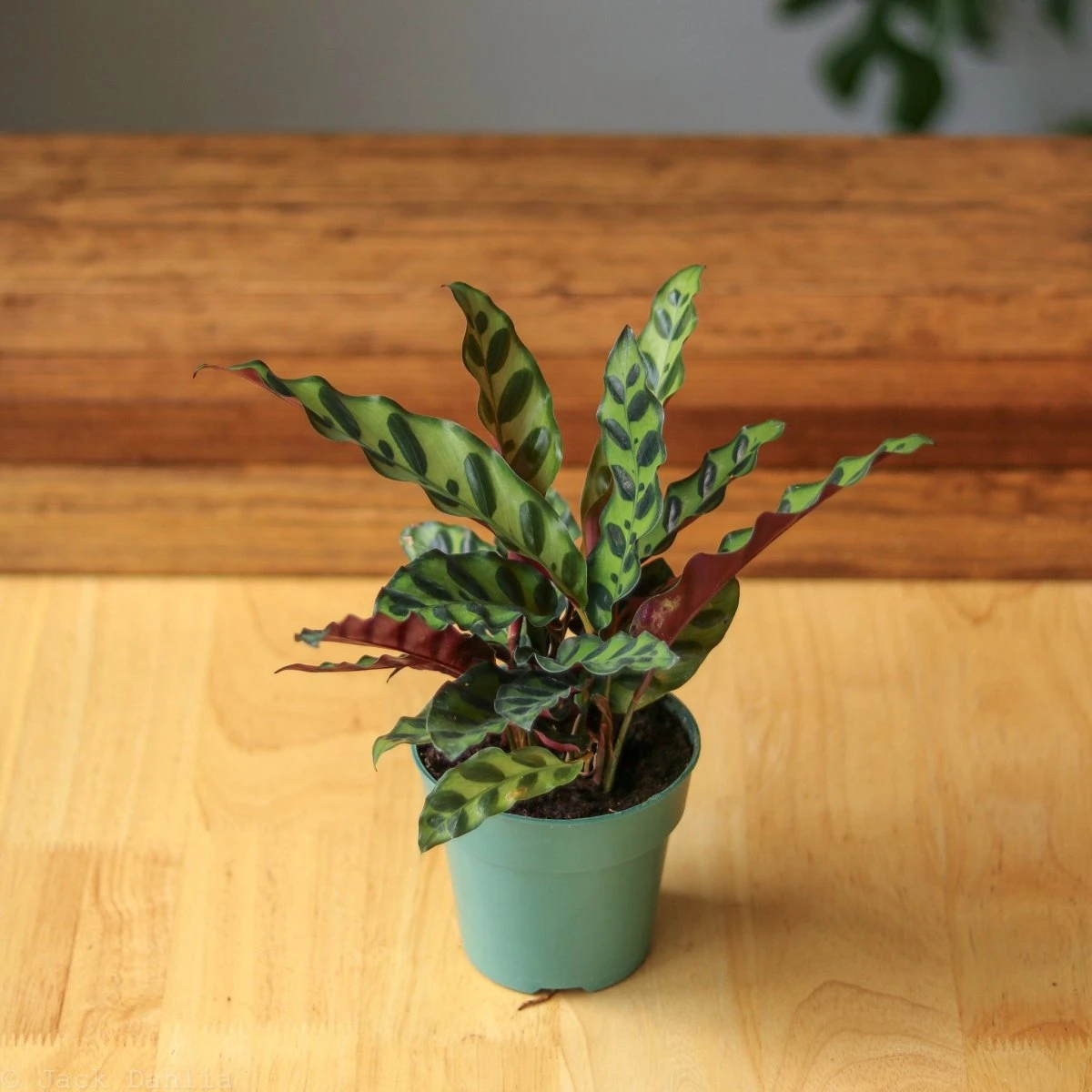 The Rattlesnake Calathea, scientifically classified as Goeppertia lancifolia (formerly Calathea lancifolia), is an eye-catching tropical plant prized for its long, lance-shaped leaves adorned with dark green, wavy markings that resemble the patterns of a rattlesnake’s skin. Adding to its exotic appeal, the undersides of the leaves showcase a deep purple hue, creating a stunning contrast that enhances its visual impact. A low-maintenance, pet-friendly houseplant, this Calathea is a must-have for plant lovers seeking bold, dynamic foliage in their indoor collection.