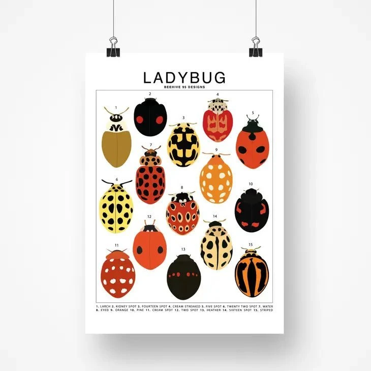 Our museum-quality art prints are perfect for any botanical lover or insect enthusiast! This insect art print features various species of Ladybug (Ladybird). All illustrations have unique designs and each species variety is numbered and identified at the bottom of the print.