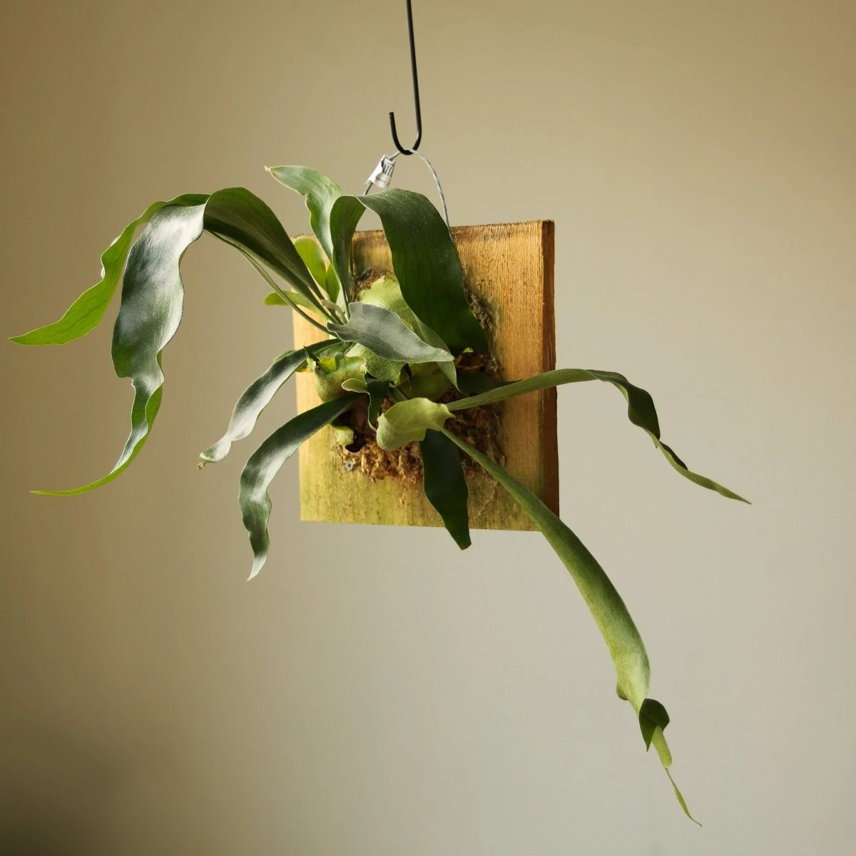 Unlike most houseplants, the Staghorn Fern doesn’t grow in soil. Instead, it’s an epiphyte, which means it naturally grows on other plants or surfaces in the wild. Mounted on wood mimics its natural habitat, where it would attach to trees in tropical forests!
