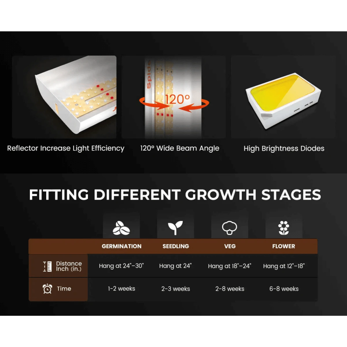 Grow smarter with the Spider Farmer SF300, a compact, full-spectrum LED grow light engineered for vigorous vegetative growth. Using 192 Osram diodes, it delivers 75 µmol/s PPF with just 33 watts, making it ideal for seedlings, clones, and leafy greens.