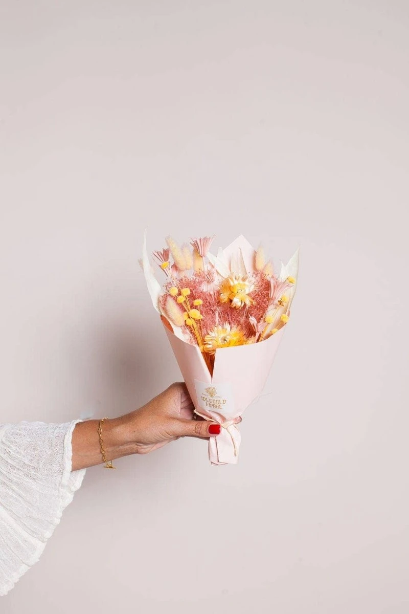 The Sunset Mini Bouquet is a delicate and beautifully preserved arrangement that captures the warm, golden hues of a sunset. Handcrafted by skilled designers in our California studio, this long-lasting dried floral bouquet is perfect for adding an elegant touch to your home, special event, or as a heartfelt gift.